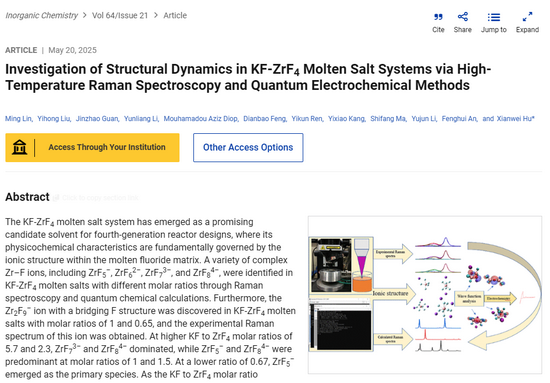 研究聚焦于第四代核反应堆-熔岩堆的应用背景,其核心特点是使用熔融状态的氟化物或氯化物盐作为燃料载体或冷却剂。与传统固态燃料反应堆相比,熔盐堆在安全性、资源利用效率和核废料处理等方面具有显著优势,被誉为核能领域的革命性技术之一。但是存在材料腐蚀控制、燃料循环处理、核废料处理等技术难题。通过选用不同摩尔比的KF/ZrF4融盐体系,采用实验方法+理论模拟的方法进行研究。实验采用高温拉曼测试,并解释拉曼峰的位置,同时以量子化学理论计算并模拟拉曼峰,最后用电化学技术研究离子在熔盐反应中的反应动力学过程。